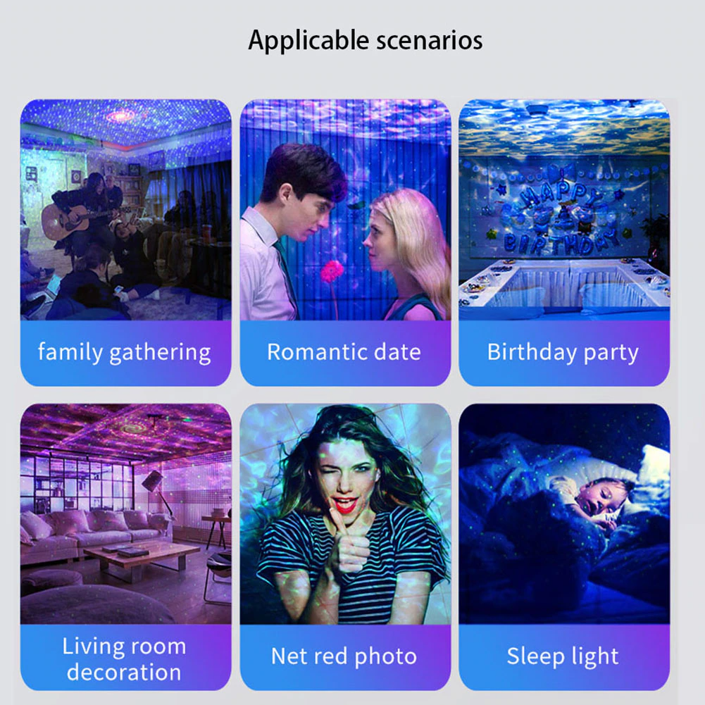 he starlight ceiling constellation projector can be used in bedrooms, game rooms, home theaters, desk decorations, room décor aesthetic, living rooms to provide a cool atmosphere for date nights, game setups, movie nights, parties or as a night light to accompany kids to sleep.